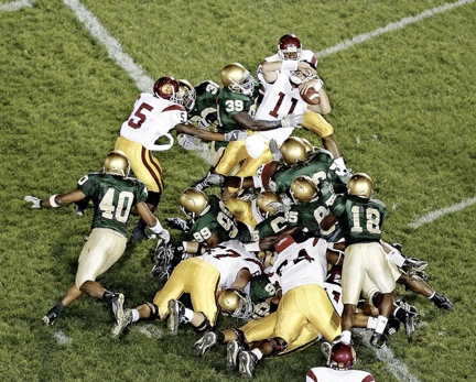 “Turns out the ball was fumbled and should have stopped the clock. SC got the ball with seconds left on the clock. Leinart was pushed over the goal line by Reggie Bush for a 34-31 USC win!”