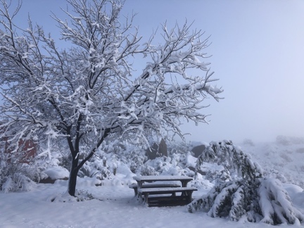 The evergreen brush consists primarily of Manzanita, Red Shank, and Chamise. These plants paint the hills with deep forest green. The only times that these hills are not green is when they are white. Several days in the winter, the hillside is dusted in snow. Snow stays for a day or two, converting the area to a winter wonderland.