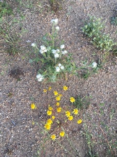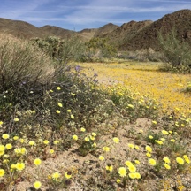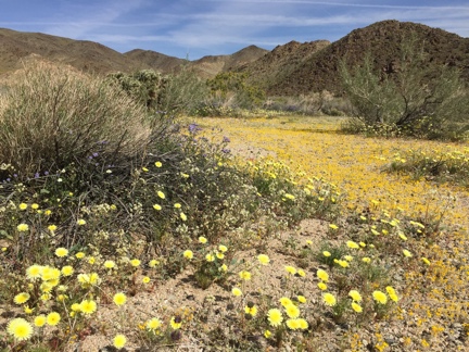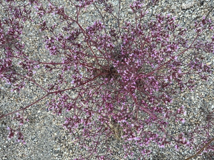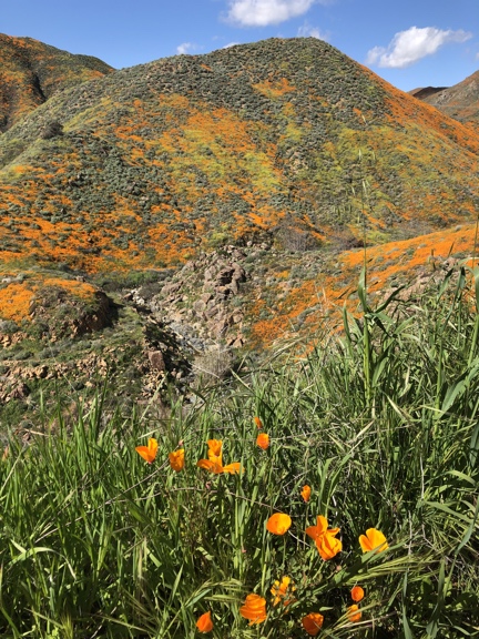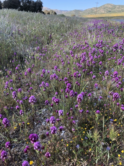There are small yellow-throated Ground Pink flowers, bright magenta Red Maids, yellow Southern Suncups, bright red to purple Owl’s Clover, delicate blue Baby Blue Eyes, orange and yellow California Poppies, spiky clusters of blue-purple Blue Dicks, bright yellow daisy-like Goldfields, purple wild Canterbury Bells, and yellow centered Cream Cups.