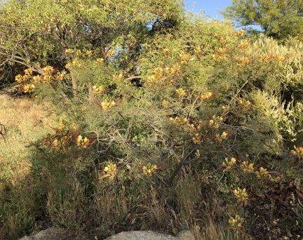 Desert Bird of Paradise has yellow-orange flowers spiked with a shock of red.