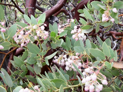 Manzanita blooms from January to March with urn-shaped pink and white flowers. The bees swarm over these plants in the Spring.