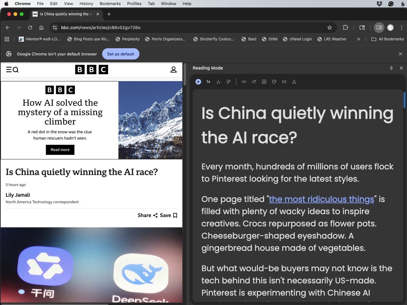 Chrome is a popular cross-platform browser. Its Reader mode is minimal. Rather than converting the entire web page to readable text, Chrome adds a sidebar with the text in it. The command to turn on Reading Mode is hidden and difficult to find. It is in the upper right hamburger menu > More Tools > Reading Mode.
