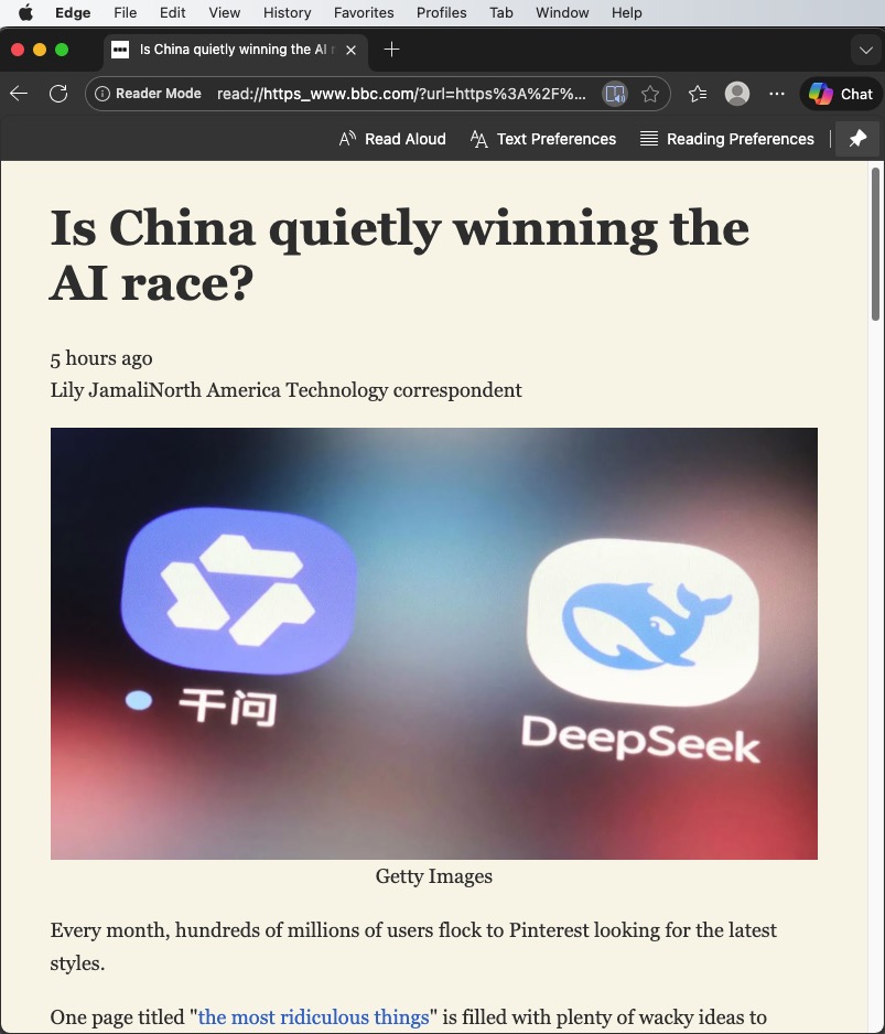Edge browser comes with Windows and is available for the Mac. Its Immersive Reader is a Swiss Army Knife of reading features. The Open Immersive Reader command is inside an ellipsis at the right edge of the address bar. Its close icon is displayed in the address bar in the form of a book icon. Immersive Reader is as clean as Safari, eliminating advertisements and displaying text with embedded graphics.